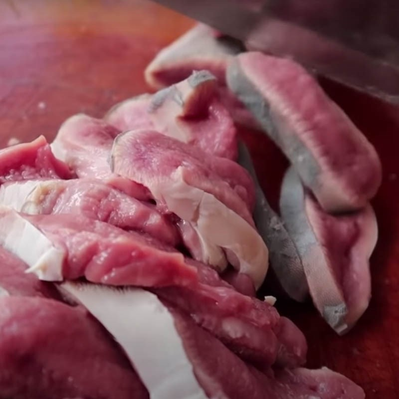 Lưỡi bò sau khi đã được sơ chế sạch sẽ và loại bỏ mùi hôi, chúng ta tiến hành thái thành từng lát mỏng vừa ăn, sau đó cho vào một chiếc tô.